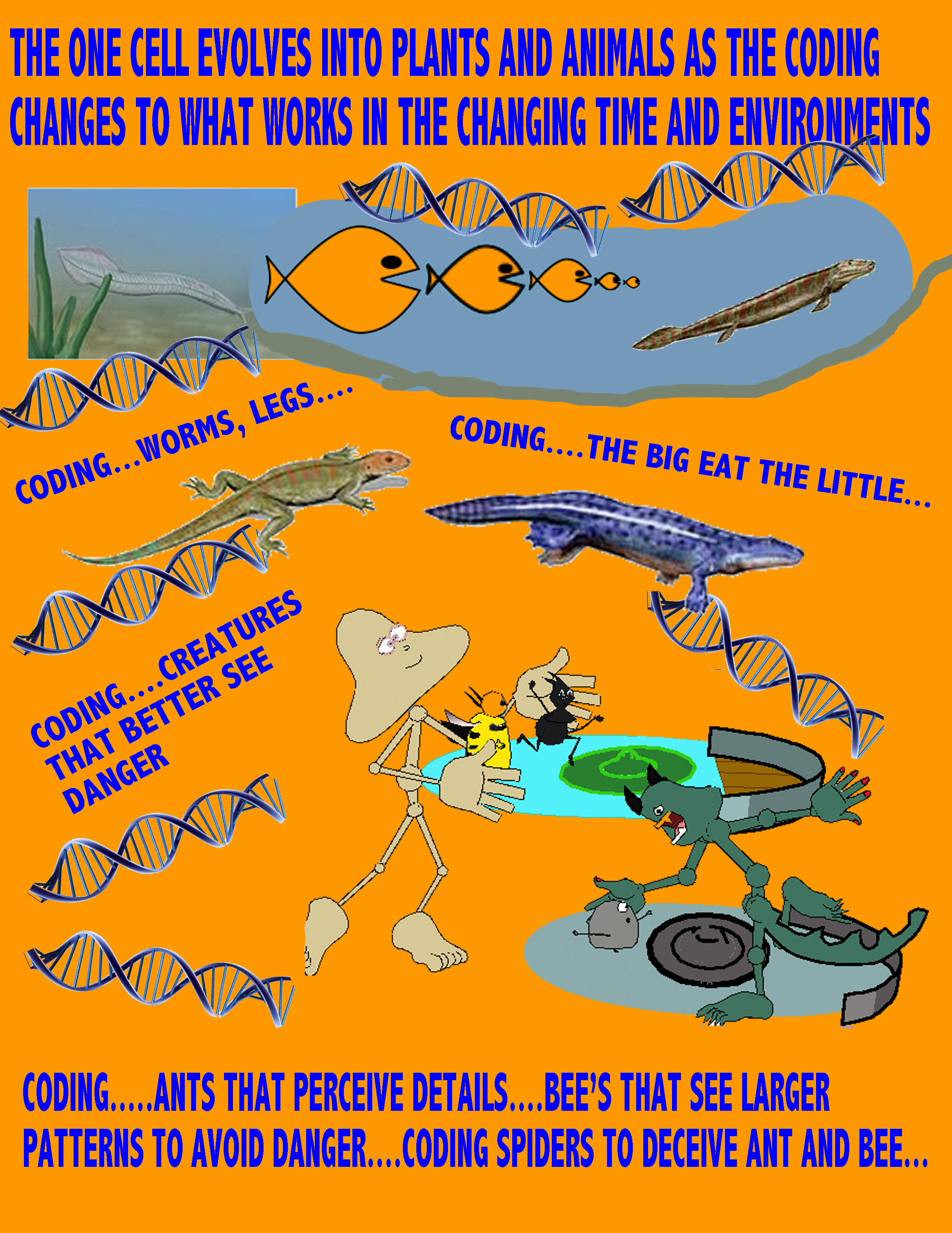 These molecular tools began to create organisms that became more and more complex. Like little computers creating DNA and turning genes on and off to fit the environment. The organisms compete for resources. It was a existence of eat or be eaten. Sensory input was one of the first steps in creating intelligent brains. Ant and Bee are good examples of that. Ant see’s, hears, smells, tests, and touches details and Bee perceives larger patterns.