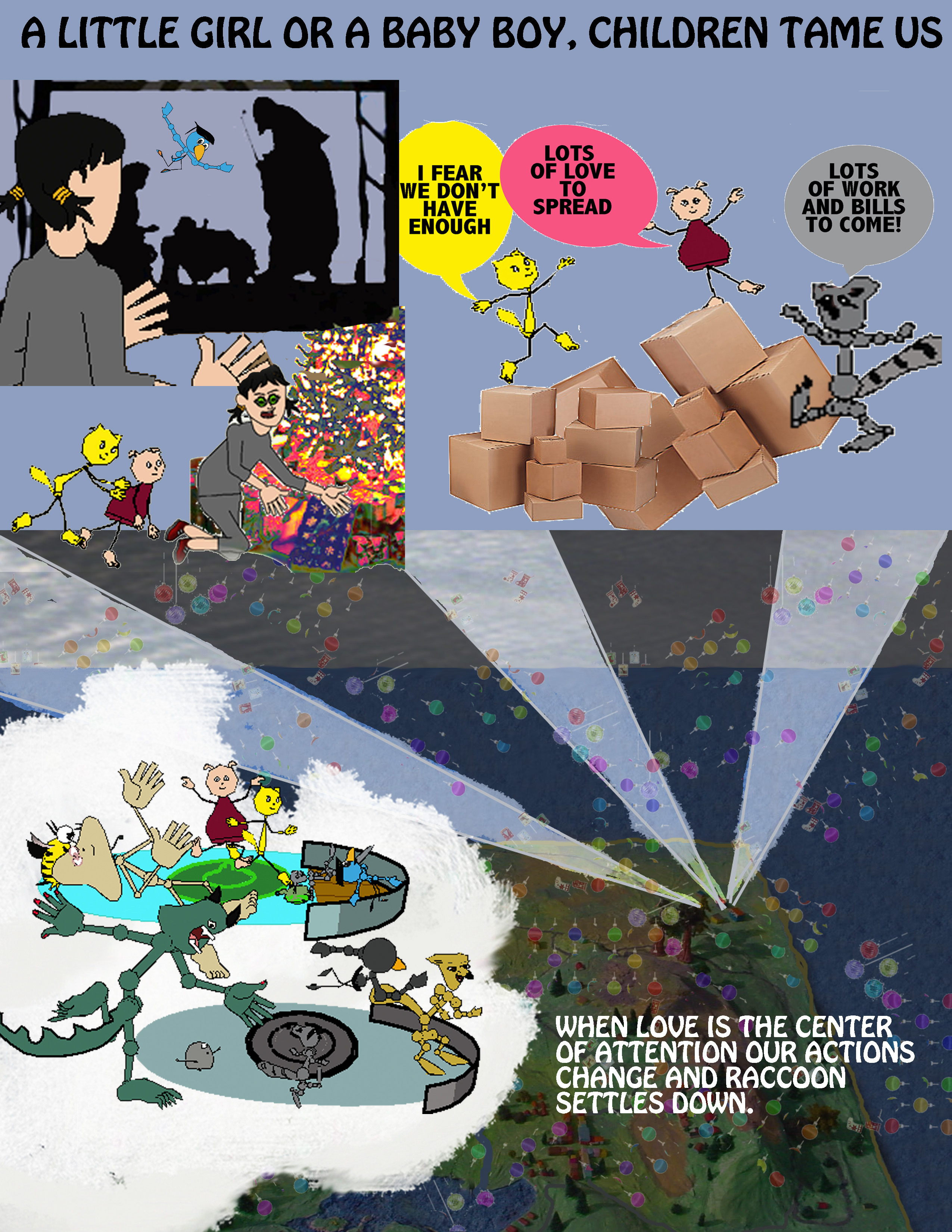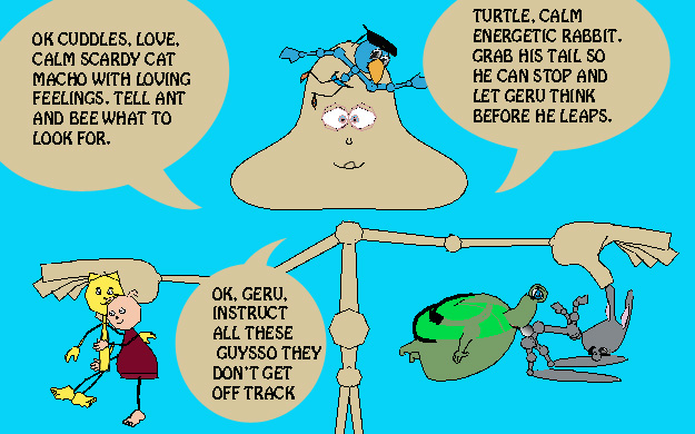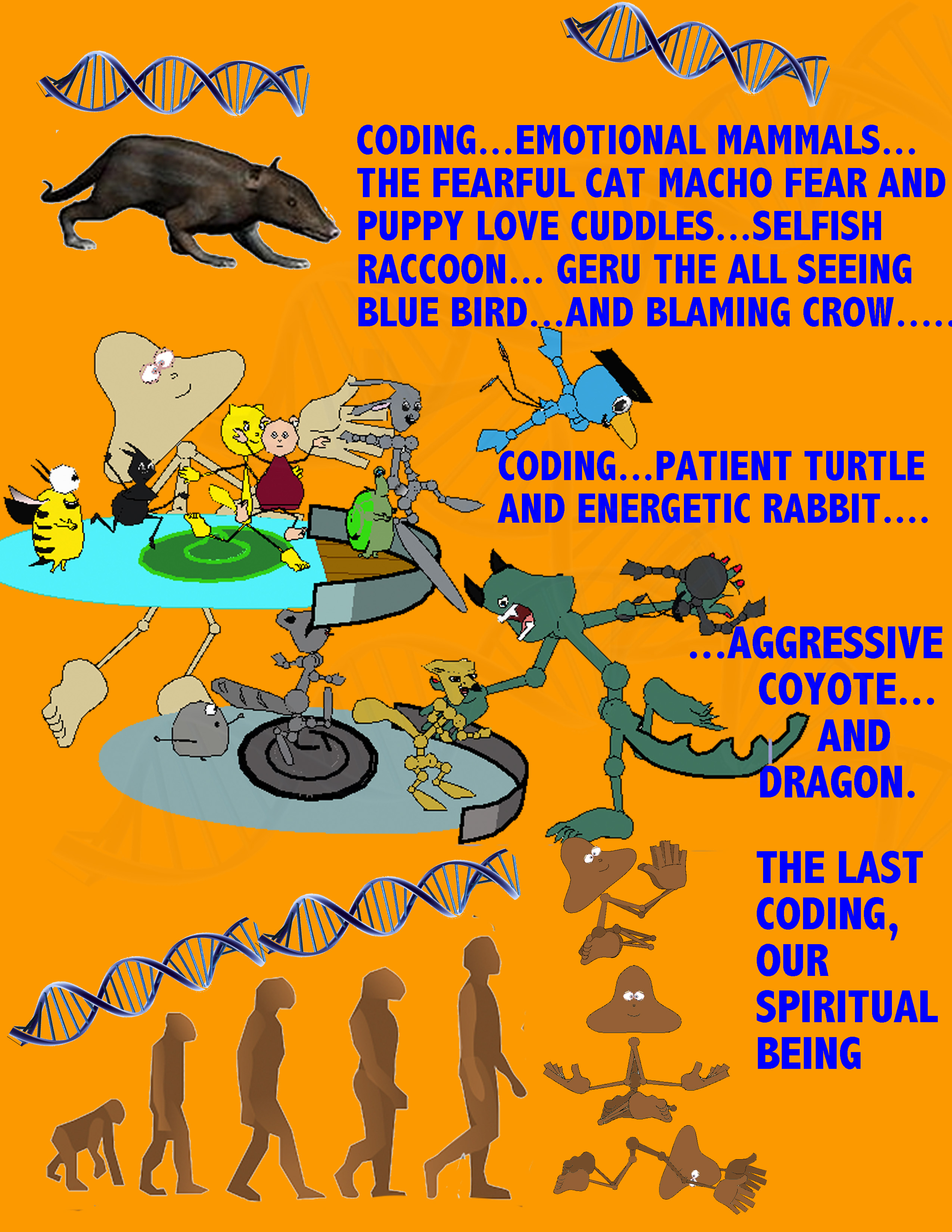 As organisms’ brains became more complex the young needed a mother and/or a father to bond to them long enough to protect them in the longer and longer developmental stages. Fear and love in animals are represented by Macho Cat and loving Cuddles the dog. Geru the blue bird represents complex belief systems needed for the mind to organize its experiences. Patient Turtle and energetic Rabbit represent the part of the brain that takes action. Deceptive Spiedie, selfish Raccoon, blaming Crow, and aggressive Coyote represent the Lower Nature, or survival mode that developed to avoid being killed and devoured.