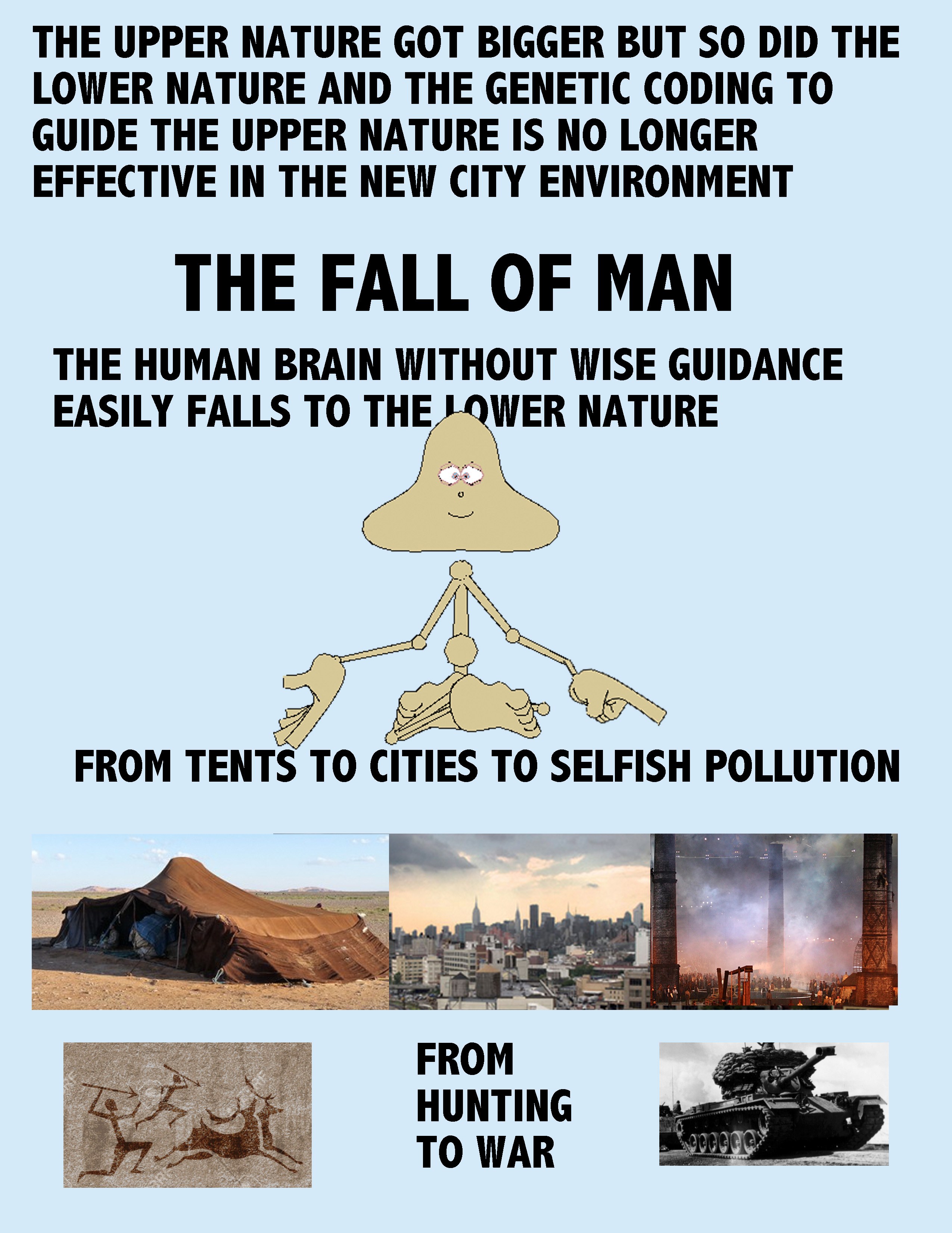 Coding did not put a ceiling on many human traits, as how deceptive, or greedy, or blaming and aggression should we display? The environment set ceilings by what was possible to do. People had to change with the environments that limited or expanded their activities. As we created bigger more deadly weapons our influence on others and nature became more and more helpful or destructive. The ceiling of what we can do is only limited by our imaginations, time, and technology. Our advances can be for survival or counter survival. The Lower Nature can disregard the Upper Nature and only use the UN to create more havoc and evil.
