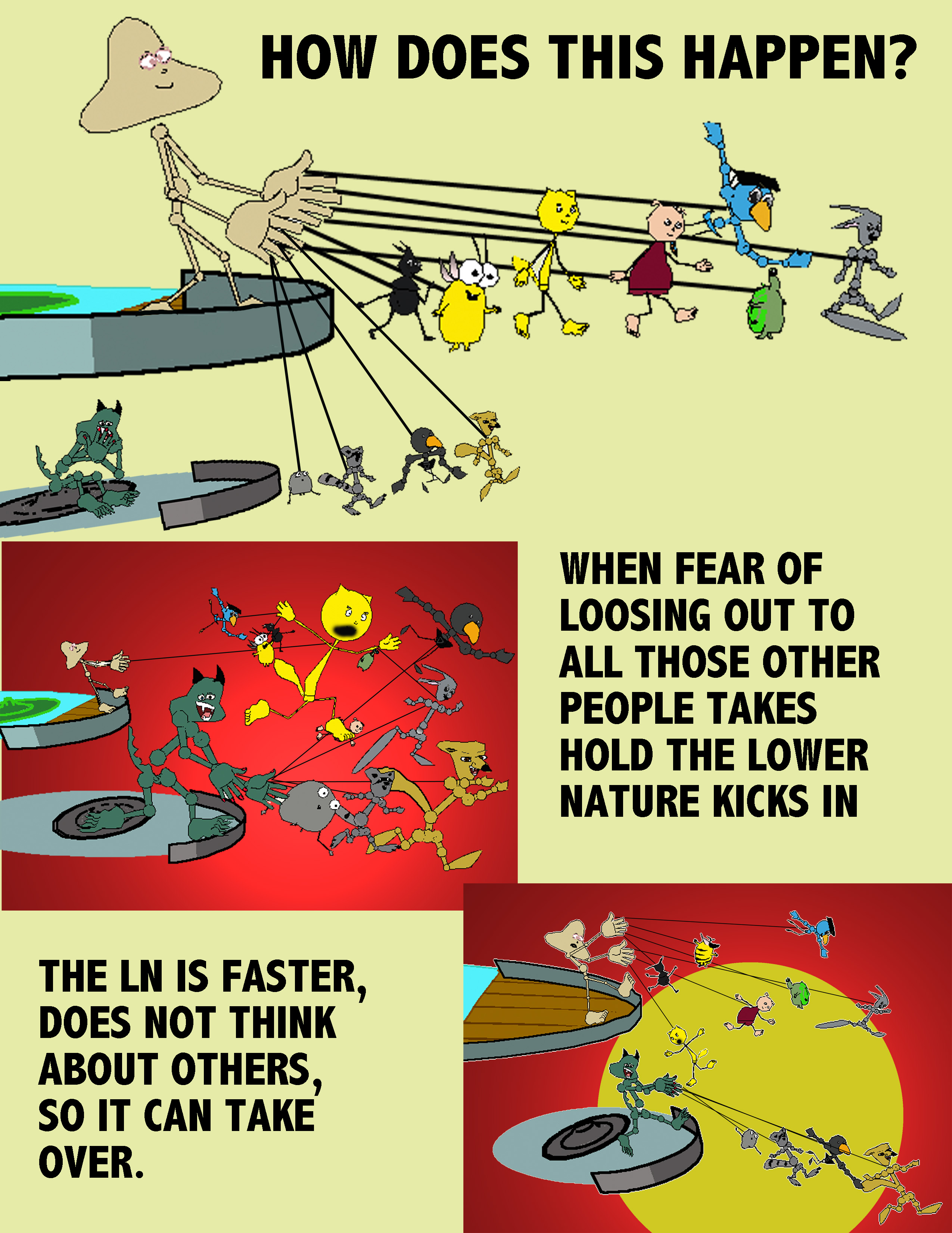 Fear can close down the Upper Nature to only utilize it for defensive reasons. But it can respond to false dangers, that appear to them to be dangerous but are not. There is a inherent conflict between the Upper and Lower Nature. Many people will go with their Lower Nature because it is easier than to stop and think. Life becomes dark and depressed with only addictions or negative thoughts.