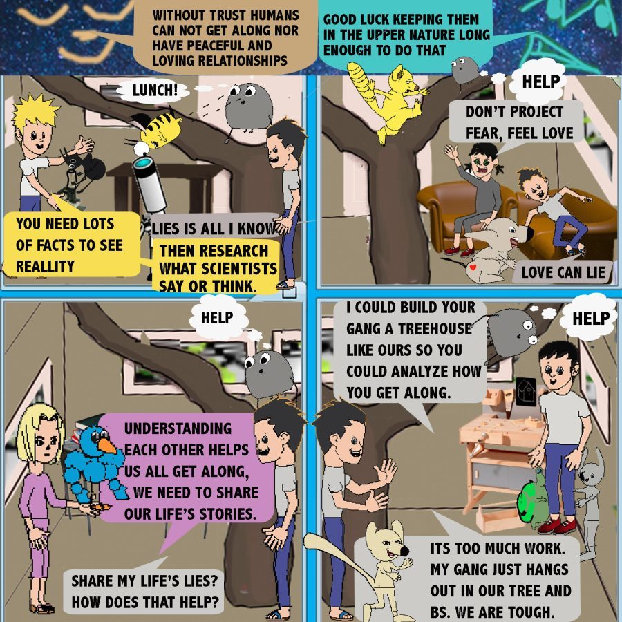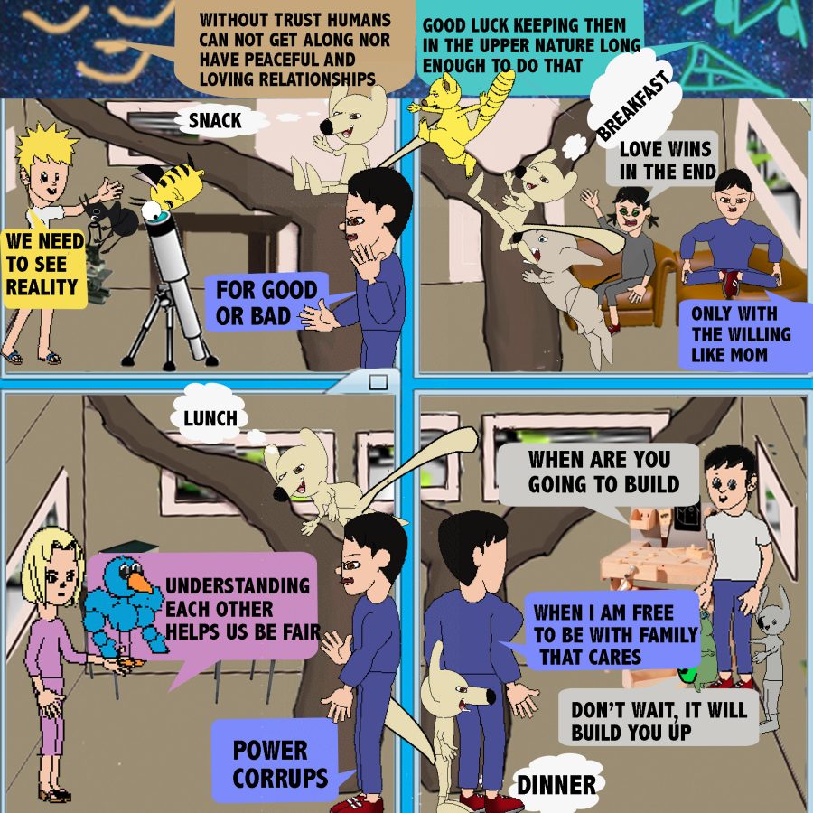 Trust is built on the ability to accurately predict how the other person see’s you, feels about you, thinks about you, and will act in the relationship. To be trustworthy we need to understand our own perceptions, emotions, thoughts, and actions. With introspection we can better predict ourselves and other can better predict us. In the following cartoons Edgar, Molly, Sue, and George operate more from their Upper Natures. They are more altruistic and trustworthy. They want to help their friends, Ragde, Charolette, Destony, and Larry who too often operate in their Lower Natures and can be less predictable.